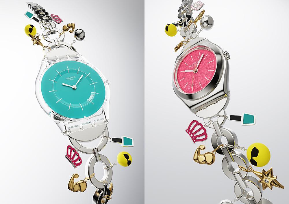3 月 2 日,Swatch 推出两款母亲节特别款腕表,它们分别叫“无敌妈咪”和“百变妈咪”,前者采用 34 毫米直径的超薄绿松石色表壳,后者用的是 26 毫米直径的粉色表壳,它们都配备了不锈钢表链,并搭配了灵感来自俏皮表情符号的金属吊饰。